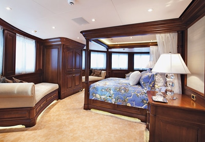 Just as much attention was paid to the general arrangement of the interior. “They got how [the owners] like to live,” Kennedy explains. Entertaining is a priority, as is chartering, so the galley spans three decks, all tucked to port. Most of the cooking takes place on the main deck, as you’d expect, and a good-size pantry allows the stewardesses to stage platters and exit and enter the dining room without getting in each other’s way. But the owner’s deck, one level up, plus the bridge deck above that feature additional pantries, which really are akin to extra galleys. They contain microwaves and other appliances, plus far more counter space than the primary galleys aboard most other megayachts — even ones in the same size range.