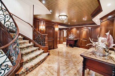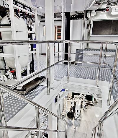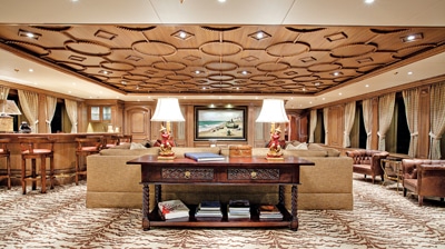 Even with their distinctly different looks, the three primary lounges, as well as other gathering areas, are all in proportion. Nowhere do you feel as if you’re aboard a sprawling ship. That’s a feat unto itself, considering that everything about Cakewalk is huge. Her beam is nearly 47 feet. She rises six decks high. She employs a 400 kW bow thruster. Two of her four main gensets are MTU 12-volt 2000 M40Bs, more commonly found aboard ferries.