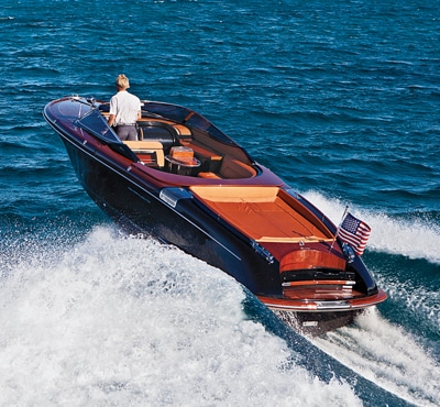 The Riva Aquariva 100 Centro is hull number 9 of only 10 made to celebrate the 100th unit of the Aquariva line. The nearly 33-footer sports the high-gloss wood of the famed Italian runabouts but guests should hold onto their champagne: Twin 370-horsepower Yanmar engines push it to 42 knots.**