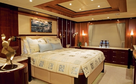 The master bath spans the house forward, with his-and-hers sides separated by a large double-headed steam shower lined in onyx. Her side has an onyx-topped vanity and an oversized walk-in closet with pull-out shoe storage. His side has a spa tub (onyx-lined, of course) and another closet. Because Anjilis was built with charter service in mind, each closet has a lockable section so the owners’ clothes can be left aboard during charters.