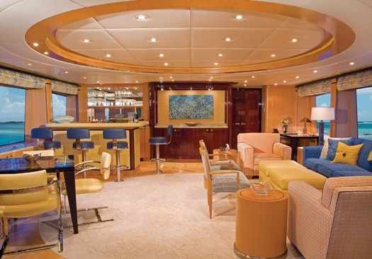 Just as the owners had planned the salon and skylounge for night and day, the color schemes and décor are equally “night and day.” Glade Johnson used a cheery mix of yellows and blues, and blended them with light-toned anigre and tropical curtains. One particularly clever touch is the subtle use of circular shapes. Overhead in the skylounge is a large circular treatment that is reflected below by circular wool carpeting set into a pale maple sole. The result is that it doesn’t feel as though there are separate areas but, rather, one large, convivial space.