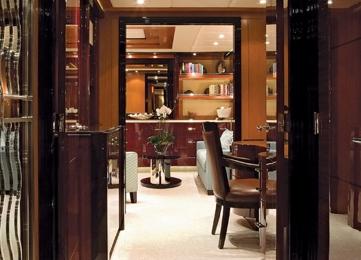 For starters, the salon in many yachts is as formal and beautiful as an Architectural Digest photo. Yet when it comes down to being either comfortable or useful, it is neither. Aboard Anjilis, the owners made the decision to switch purposes: The skylounge became the primary gathering place during the day, and the salon was turned into an entertainment area for evenings.