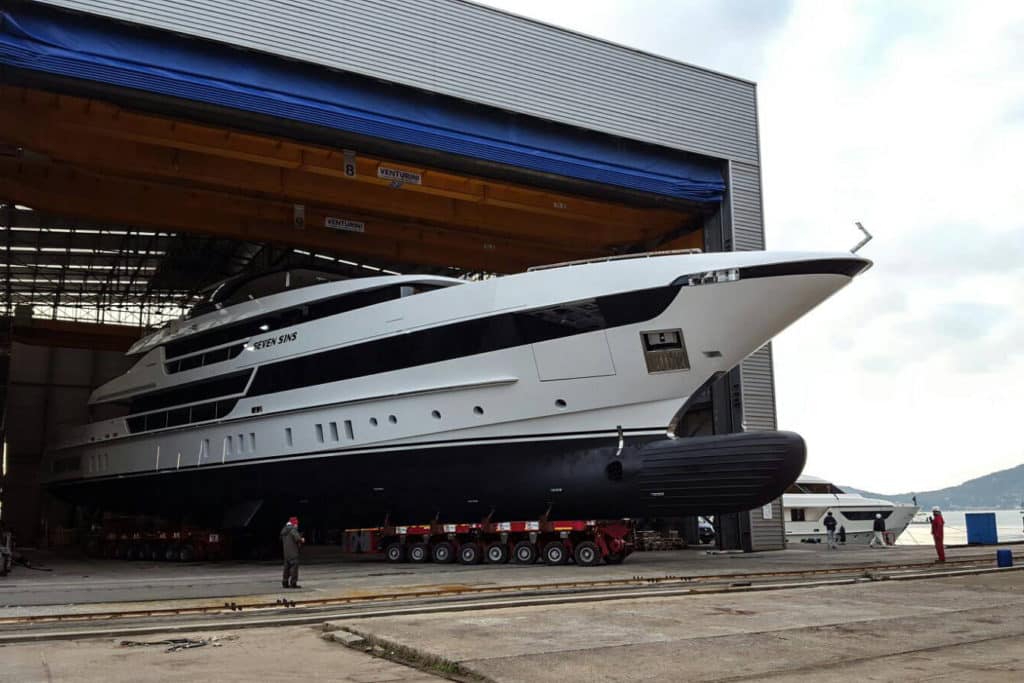 The Sanlorenzo 52Steel Seven Sins has launched at the shipyard in Italy.