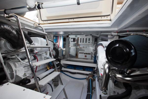 Even with such voluminous accommodations, the 48’s machinery space is large. An access hatch in the cockpit allows for easy inspections and fluid checks, and all components are neatly displayed and serviceable. The 11.5 kW generator sits on the centerline, while the fuel tanks are positioned outboard on each side, forward of the engine room.