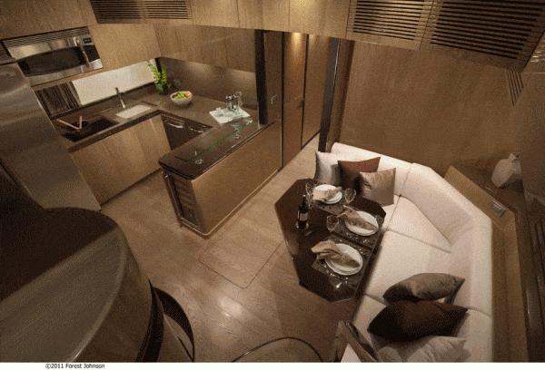 The salon follows a popular trend of creating seamless transitions between the outdoor and indoor accommodations. The only item that separates the two areas on the 76 is a well-placed bar unit that is perfectly situated for large-scale entertaining. A day-head here is also convenient. A settee and high-low table accommodate alfresco diners on the afterdeck. A Jacuzzi tub abaft the settee can be filled with fresh or salt water. The large swim platform accommodates a tender or PWC.