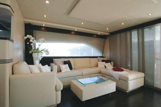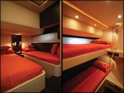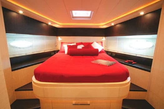 A hefty stainless steel-framed sliding door leads to the salon, where a single-level layout features the clean, modern lines of Italian styling. Dark wenge wood soles offer a pleasing contrast to white oak bulkheads and the cream-colored leather couch, chair, and ottoman to starboard. “This is the décor this particular owner wanted,” Barca said as he gestured to the light and dark woods. “However, we’ll create any statement our customers want. Unlike some builders, we’re not limited to four choices.” Directly opposite, and spanning the length of the seating area, is a finely crafted, low-profile entertainment center with plenty of stowage. Large windows on either side create a light and airy space.