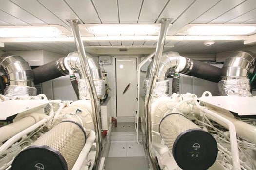After running her up to her wide-open throttle speed of 31 knots, I brought the optional twin 1,360-horsepower MAN V12 engines down to 2100 rpm and the big boat clipped along at a steady 28.4 knots. At 1900 rpm, she maintained 25 knots. Allowing for an approximate 10-percent safety margin, the 65 should have a range of about 265 nautical miles at this speed.