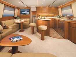 The 50’s salon has L-shaped seating aft with easy-to-lift seat tops that allow access to a cavernous storage space ideally suited for tackle. An L-shaped galley has an island counter with two stools and a dinette is a few steps away. The three-stateroom, two-head arrangement has a midship master with an island berth and two guest staterooms with upper and lower berths. There is a washer/dryer in the amidships guest stateroom. The 50’s interior is finished with the same processed teak product used throughout the Viking line and the result is a consistent highquality, high-gloss finish.