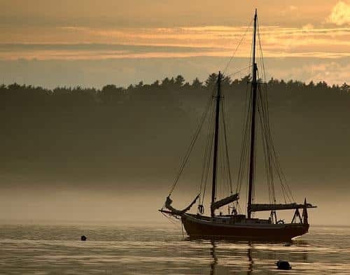 The fog in Portland finally lifted enough in the afternoon for us to continue our cruise. Heading south into Casco Bay we round Cushing and Ram Island and then head up to the entrance to Quahog Bay, 12-miles from Cape Elizabeth. While the fog has lifted, we now find ourselves dodging hundreds – probably thousands – of lobster pots. Our vessel is equipped with shaft mounted spurs designed to cut away any lines just in case we accidentally run over a buoy. We arrive at Snow Island and drop our hook near the islets to the east. This little piece of paradise is where the late Dodge Morgan, the first American to sail solo nonstop around the world in 1986, made his home. Years before his death, we anchored here where one of his beautiful wooden schooners was moored. Our dog needs to find a spit of land, so we take our dinghy to one of the islets, where we sit and watch the sun go down on this idyllic, secluded anchorage.