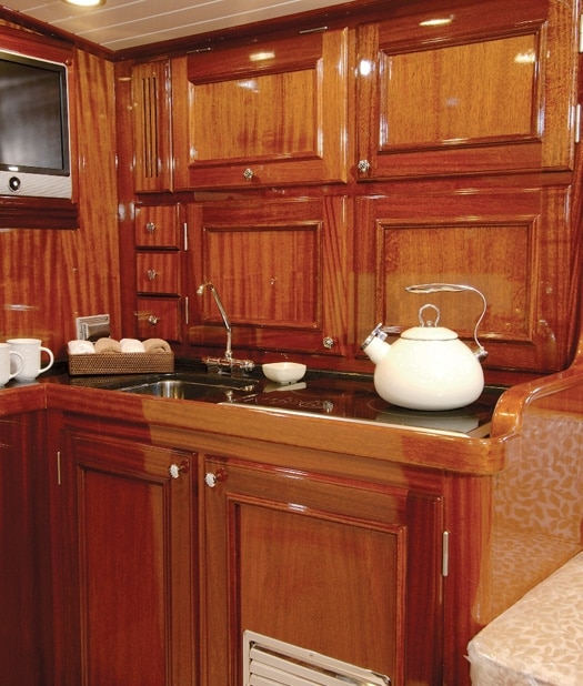 Second, this isn’t your father’s wooden boat, either. The hull, made in Turkey by the Vicem yard, is cold-molded mahogany bathed in durable WEST System epoxy resins.